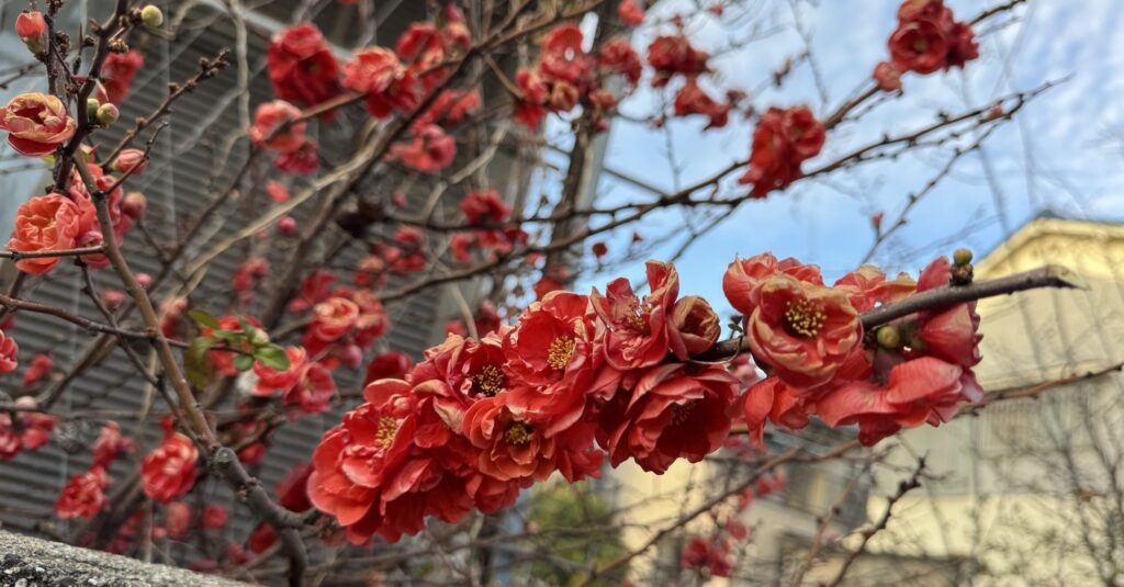 玄関に植えているボケの花(木瓜の花、と漢字では書くようです)、亡き父が亡き祖母を想って植えた大切なお花です